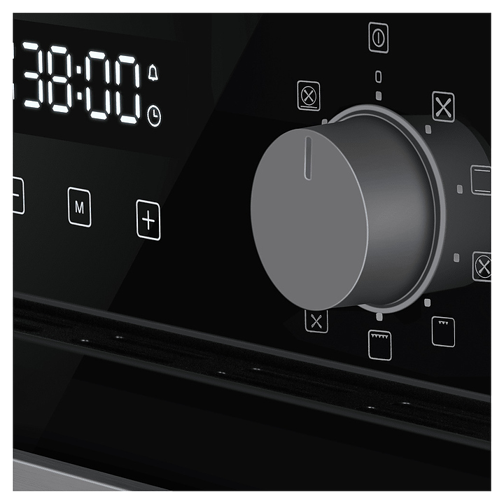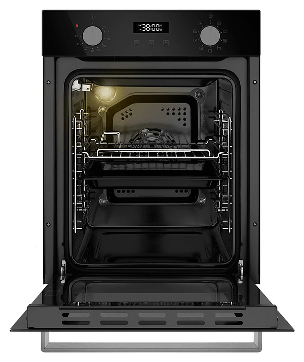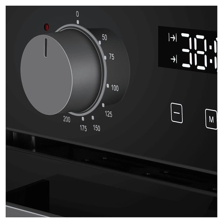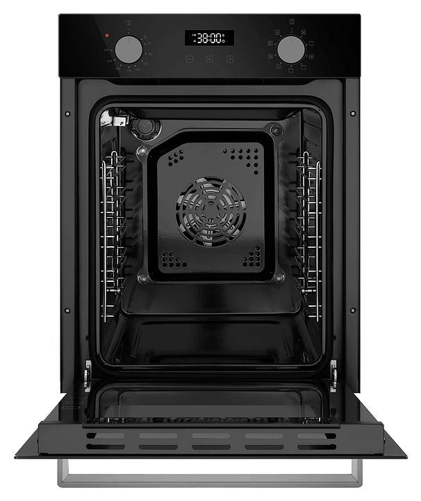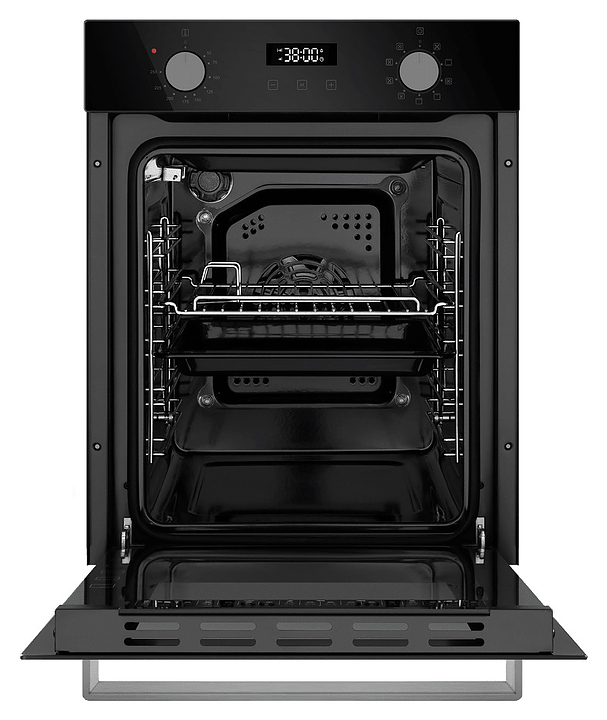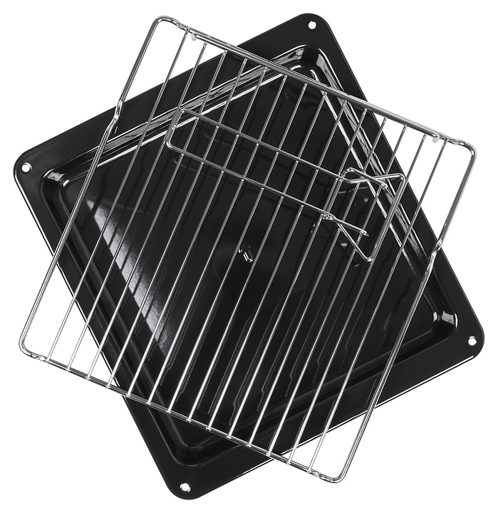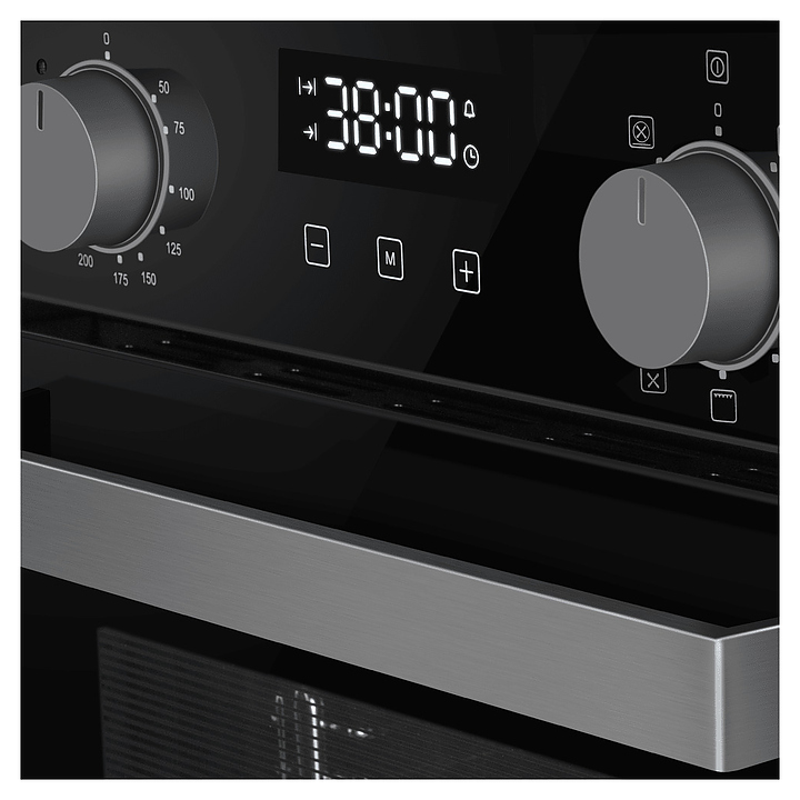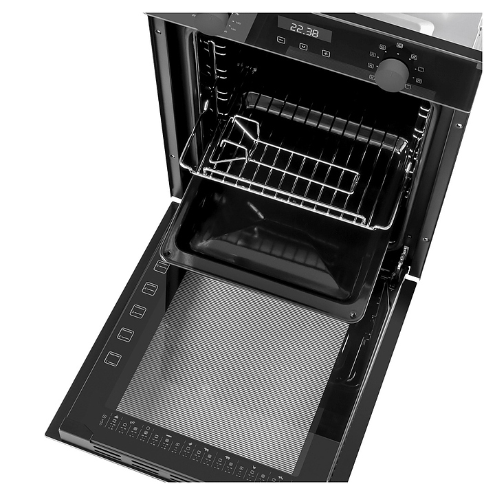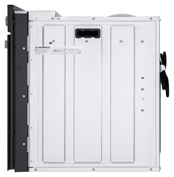 Встраиваемый электрический духовой шкаф Maunfeld EOEM519PB предназначен для приготовления большого ассортимента блюд в домашних условиях. Модель оснащена камерой с расположенными в задней стенке кольцевым нагревательным элементом и вентилятором, верхним и нижним нагревательными элементами, верхним тэновым грилем, 2 боковыми стойками с 5 уровнями направляющих для противней, откидной дверью со смотровым окном, уплощенной дугообразной горизонтальной рукояткой, кабелем питания с евровилкой, расположенной в верхней части фронта панелью управления с 2 поворотными цилиндрическими переключателями, сенсорными функциональными клавишами и светодиодным дисплеем с белой подсветкой индикации. Корпус выполнен из высококачественной стали, фронт с покрытием черного цвета и полным остеклением без винтового крепежа прозрачным закаленным стеклом, боковые стойки, решетка для гриля и прихват для противней – из металла с хромированной поверхностью, противень – из стали с эмалированным покрытием, рукоятка и переключатели – из металла с матовой поверхностью цвета нержавеющей стали.
