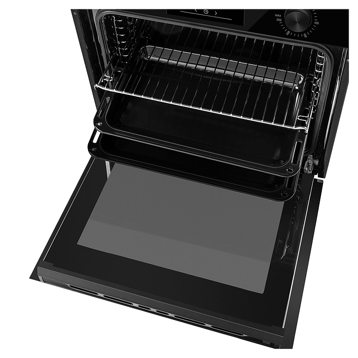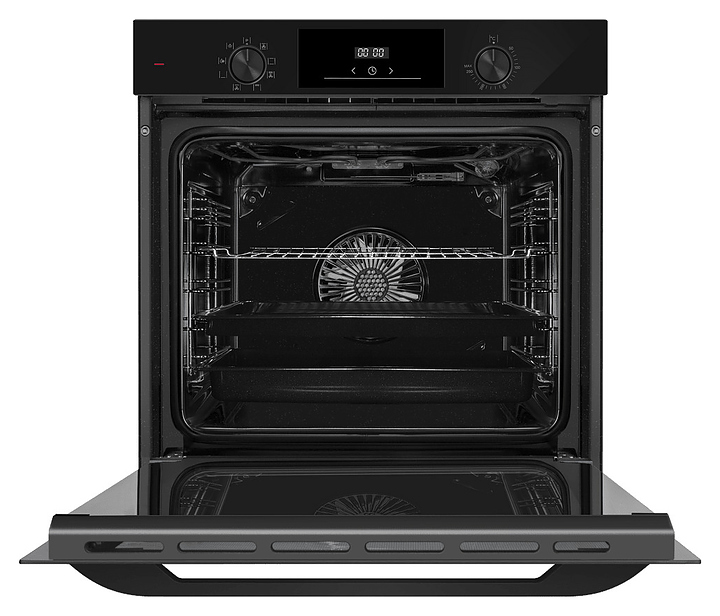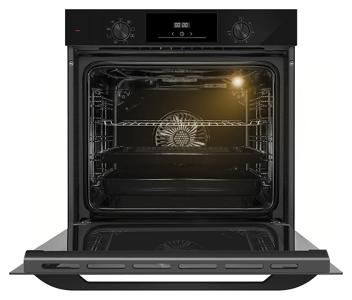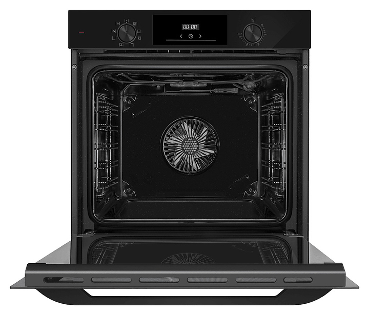 Встраиваемый электрический духовой шкаф Maunfeld FEOH7872B2 предназначен для приготовления большого ассортимента блюд в домашних условиях. Модель оснащена камерой с расположенным в задней стенке вентилятором, верхним и нижним нагревательными элементами, верхним тэновым грилем, 2 боковыми стойками с 5 уровнями направляющих для противней, откидной дверью со смотровым окном, уплощенной дугообразной горизонтальной рукояткой во всю ширину двери, кабелем питания с евровилкой, расположенной в верхней части фронта панелью управления с 2 поворотными цилиндрическими переключателями, сенсорными функциональными клавишами и светодиодным дисплеем с белой подсветкой индикации. Корпус выполнен из высококачественной стали, фасадные панели с покрытием черного цвета и полным остеклением без винтового крепежа прозрачным закаленным стеклом, боковые стойки и решетка для гриля – из металла с хромированной поверхностью, противни – из стали с эмалированным покрытием, рукоятка и переключатели – из металла с матовой поверхностью черного цвета.