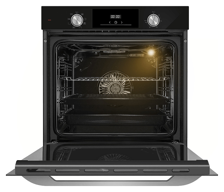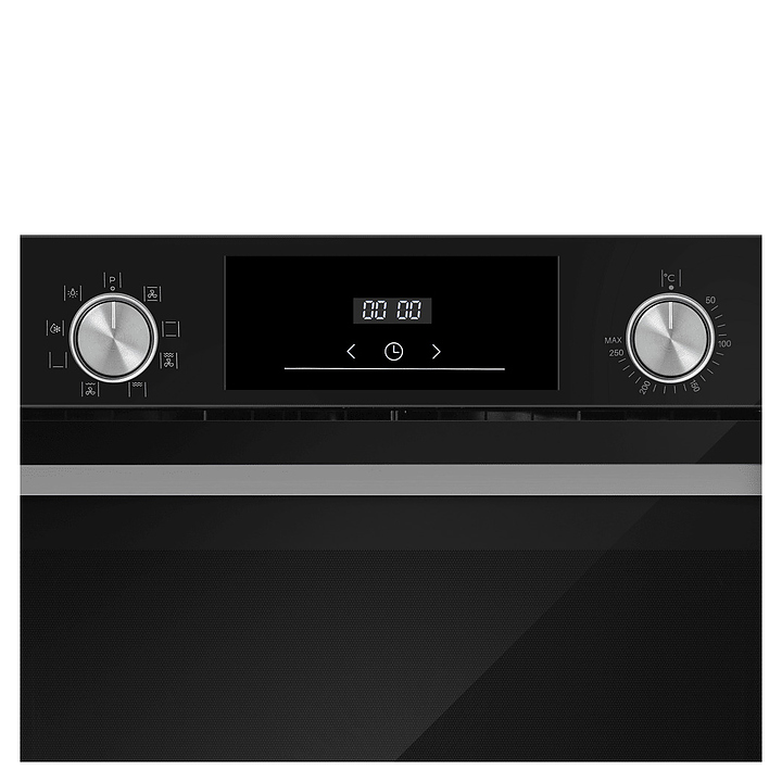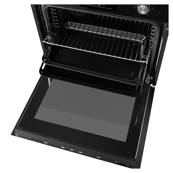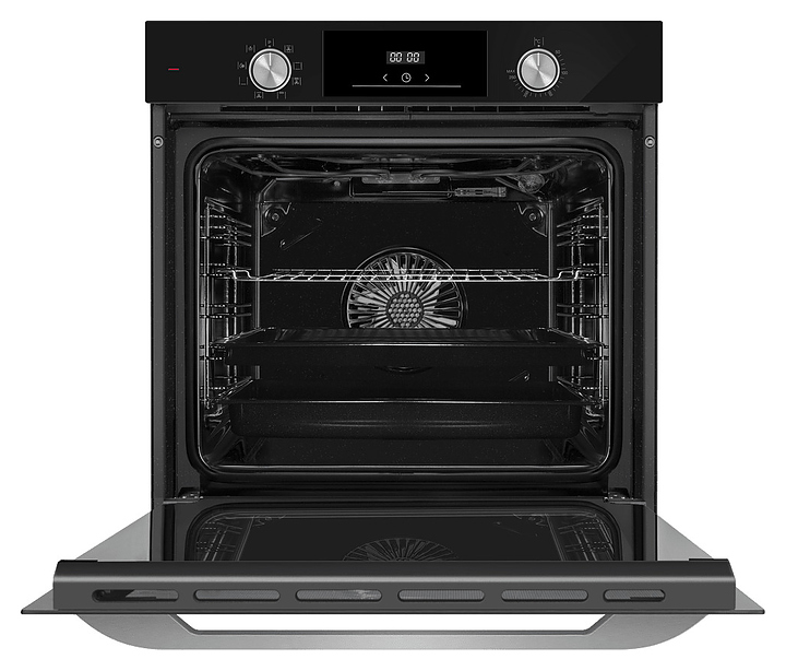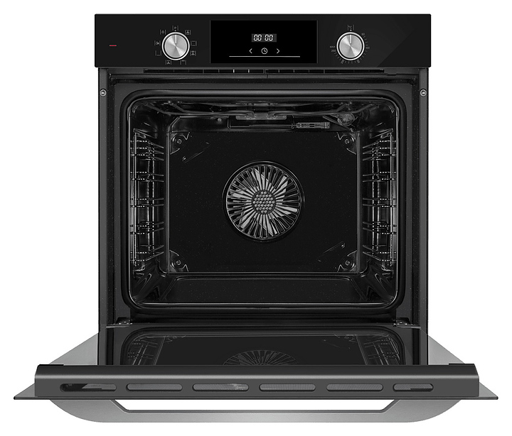 Встраиваемый электрический духовой шкаф Maunfeld FEOH7872B предназначен для приготовления большого ассортимента блюд в домашних условиях. Модель оснащена камерой с расположенным в задней стенке вентилятором, верхним и нижним нагревательными элементами, верхним тэновым грилем, 2 боковыми стойками с 5 уровнями направляющих для противней, откидной дверью со смотровым окном, уплощенной дугообразной горизонтальной рукояткой во всю ширину двери, кабелем питания с евровилкой, расположенной в верхней части фронта панелью управления с 2 поворотными цилиндрическими переключателями, сенсорными функциональными клавишами и светодиодным дисплеем с белой подсветкой индикации. Корпус выполнен из высококачественной стали, фасадные панели с покрытием черного цвета и полным остеклением без винтового крепежа прозрачным закаленным стеклом, боковые стойки и решетка для гриля – из металла с хромированной поверхностью, противни – из стали с эмалированным покрытием, рукоятка и переключатели – из металла с матовой поверхностью цвета нержавеющей стали.