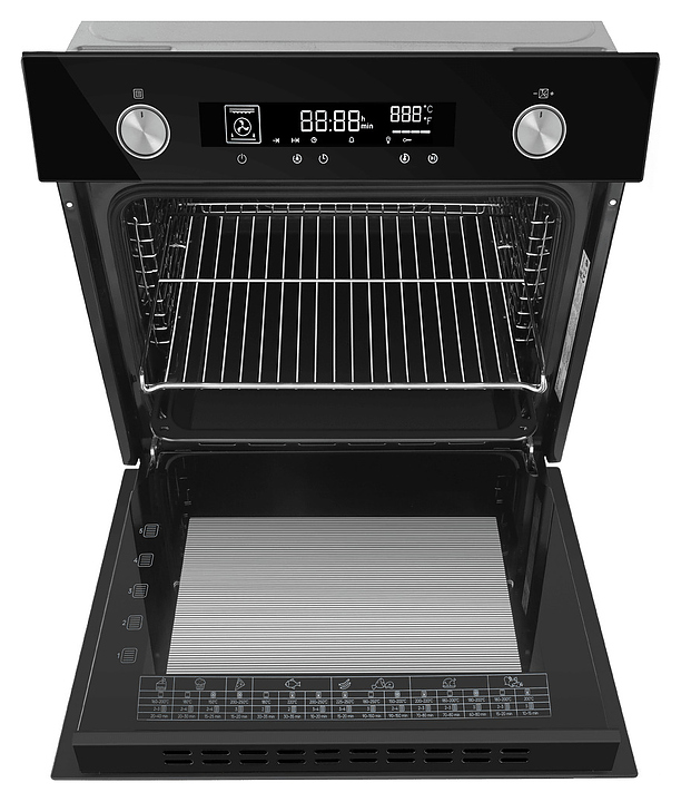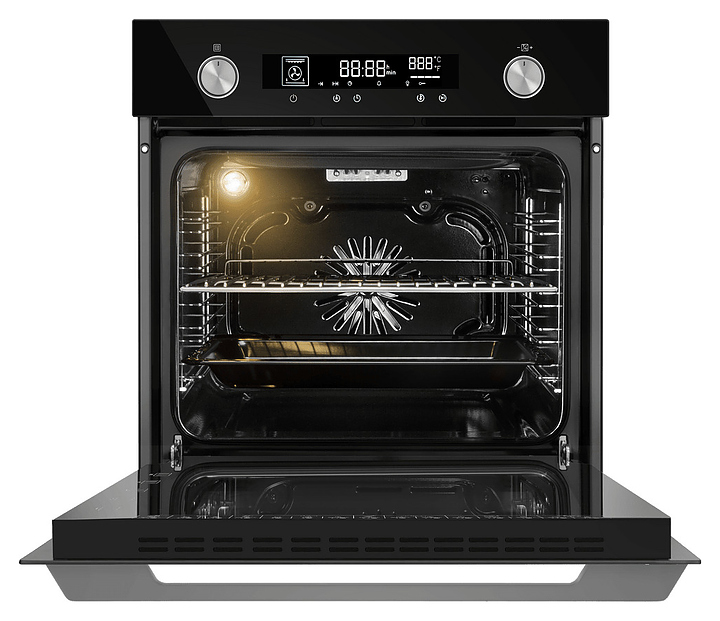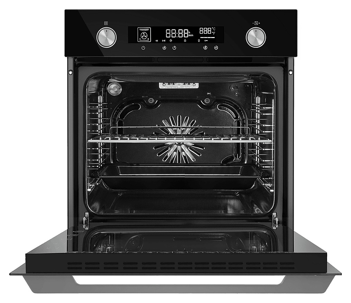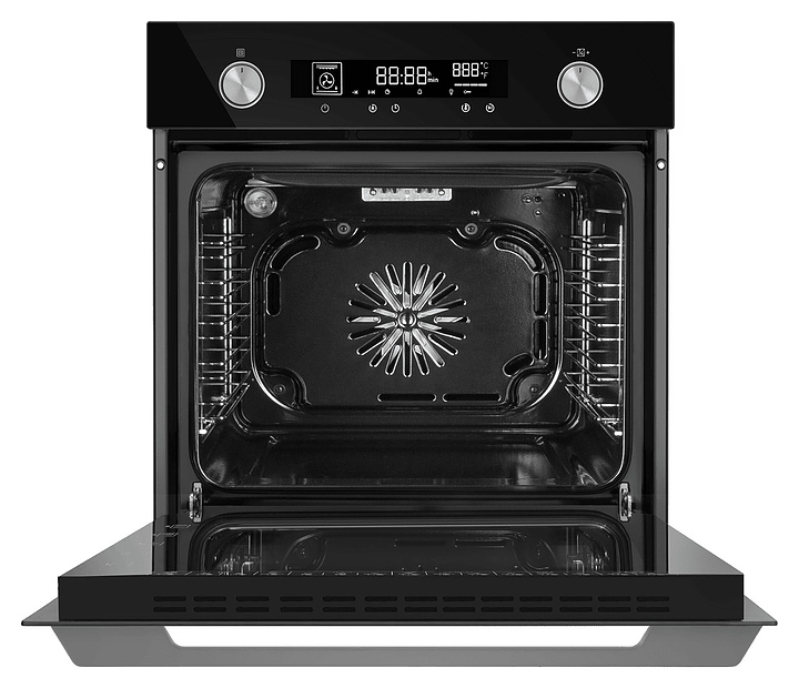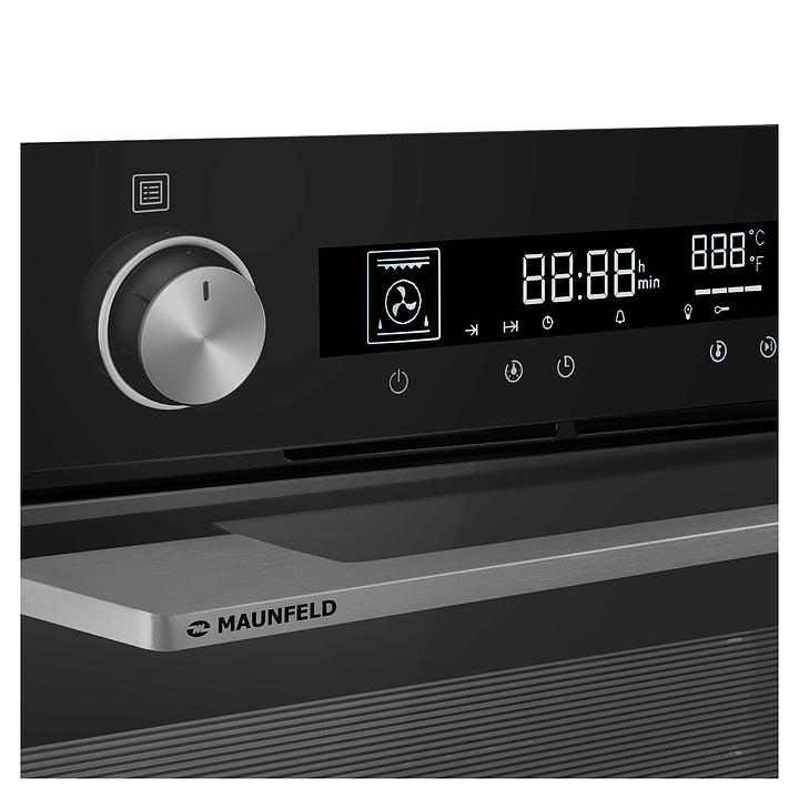 Встраиваемый электрический духовой шкаф Maunfeld AEOH6066B предназначен для приготовления большого ассортимента блюд в домашних условиях. Модель оснащена камерой с расположенным в задней стенке вентилятором, верхним и нижним нагревательными элементами, верхним тэновым грилем, 2 боковыми стойками с 5 уровнями направляющих для противней, откидной дверью со смотровым окном, уплощенной дугообразной горизонтальной рукояткой во всю ширину двери, кабелем питания с евровилкой, расположенной в верхней части фронта панелью управления с 2 поворотными цилиндрическими переключателями, сенсорными функциональными клавишами и светодиодным дисплеем с белой подсветкой индикации. Корпус выполнен из высококачественной стали, фасадные панели с покрытием черного цвета и полным остеклением без винтового крепежа прозрачным закаленным стеклом, боковые стойки и решетка для гриля – из металла с хромированной поверхностью, противень – из стали с эмалированным покрытием, рукоятка и переключатели – из металла с матовой поверхностью цвета нержавеющей стали.