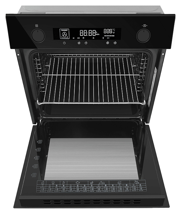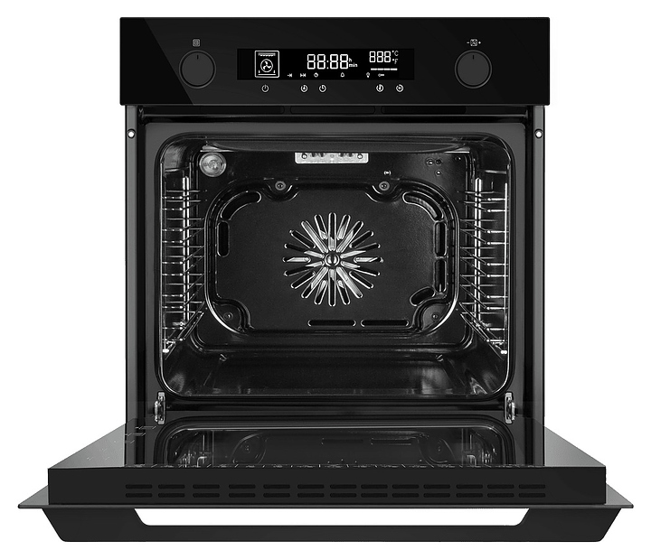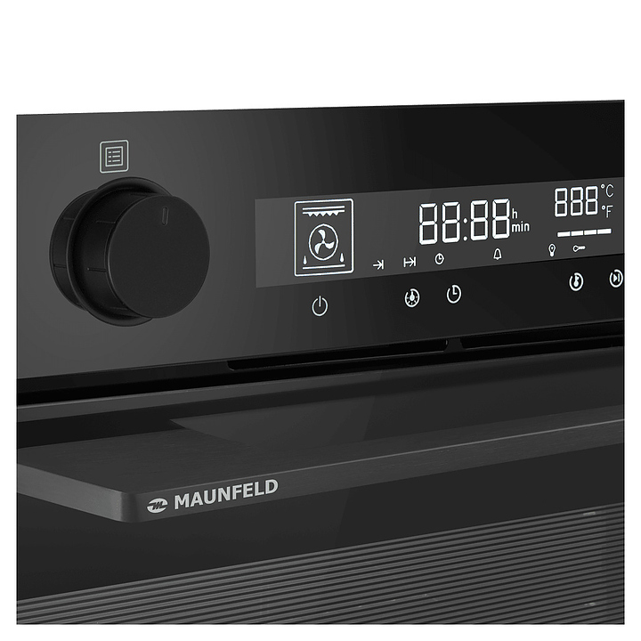 Встраиваемый электрический духовой шкаф Maunfeld AEOH60106B2 предназначен для приготовления большого ассортимента блюд в домашних условиях. Модель оснащена камерой с расположенными в задней стенке вентилятором и кольцевым нагревательным элементом, верхним и нижним нагревательными элементами, верхним тэновым грилем, 2 боковыми стойками с 5 уровнями направляющих для противней, откидной дверью со смотровым окном, уплощенной дугообразной горизонтальной рукояткой во всю ширину двери, кабелем питания с евровилкой, расположенной в верхней части фронта панелью управления с 2 поворотными цилиндрическими переключателями, сенсорными функциональными клавишами и светодиодным дисплеем с белой подсветкой индикации. Корпус выполнен из высококачественной стали, фасадные панели с покрытием черного цвета и полным остеклением без винтового крепежа прозрачным закаленным стеклом, боковые стойки и решетка для гриля – из металла с хромированной поверхностью, противень – из стали с эмалированным покрытием, рукоятка и переключатели – из металла с матовой поверхностью черного цвета.