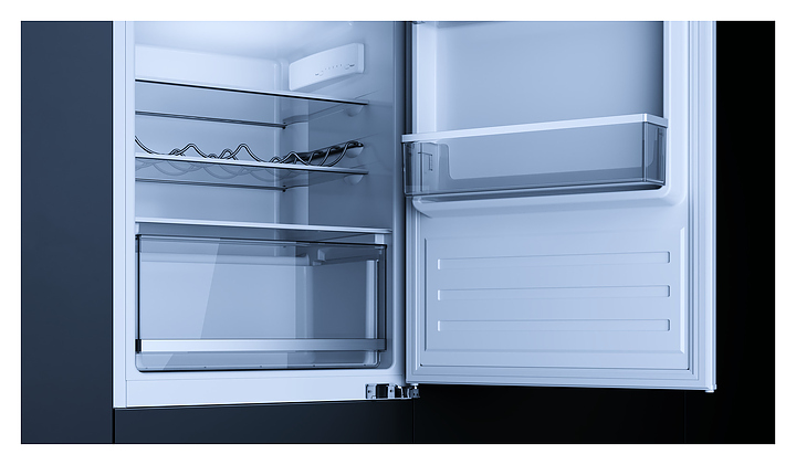 В холодильном отделении имеется три полки из ударопрочного стекла, две из которых можно переставить по высоте для удобства хранения различных продуктов, также в холодильнике есть три полки на двери и один ящик для овощей и фруктов
