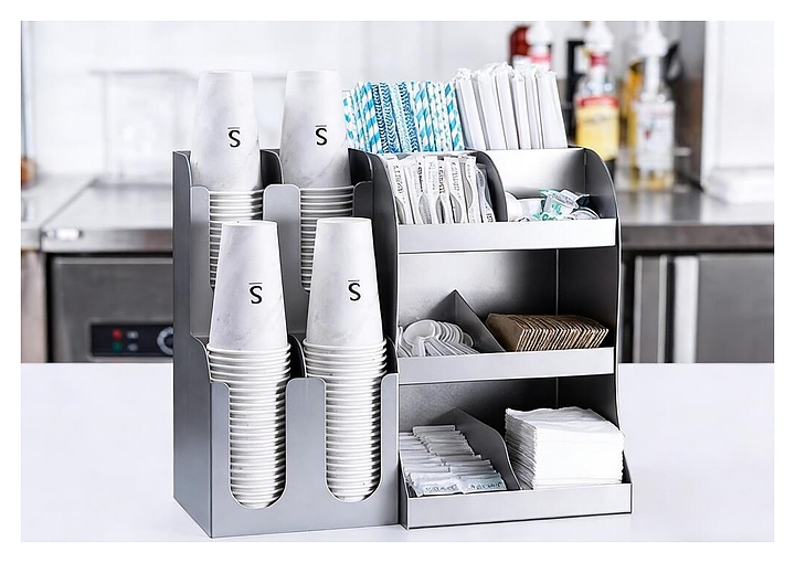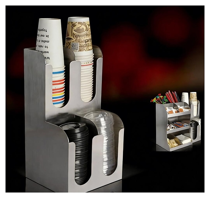 Диспенсер P.L. Barbossa S0565-4 используется на предприятиях общественного питания и торговли, в офисах, гостиницах и на мероприятиях с организацией шведского стола для компактного гигиеничного хранения и раздачи одноразовых стаканов, крышек и других аксессуаров для приготовления напитков. Модель оснащена 8 ячейками. Корпус выполнен из нержавеющей стали. Дополнительные характеристики: