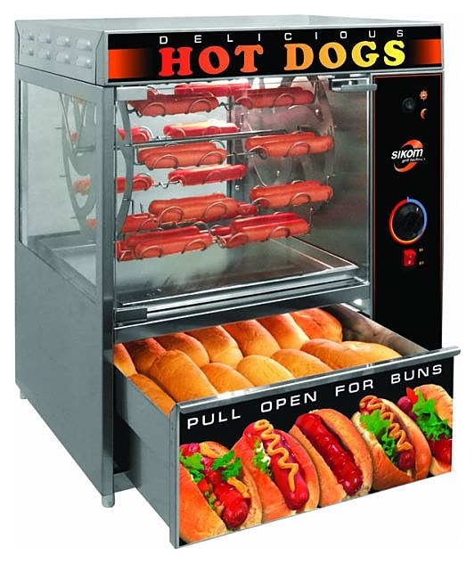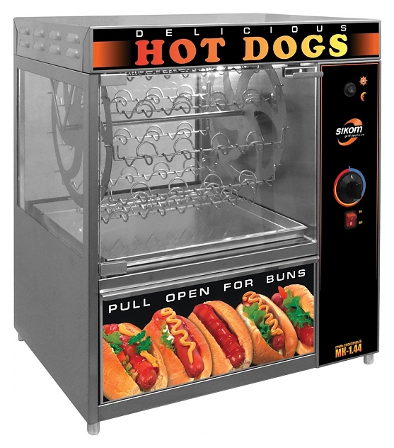 Компактный карусельный гриль с люлечным вертелом Sikom МК-1.44М предназначен для приготовления хот-догов в заведениях быстрого питания, супермаркетах и уличной торговли. Модель оснащена подогреваемым ящиком для булочек, подсветкой и поддоном. Корпус выполнен из нержавеющей стали, дверца и 2 стенки - из стекла. Особенности: