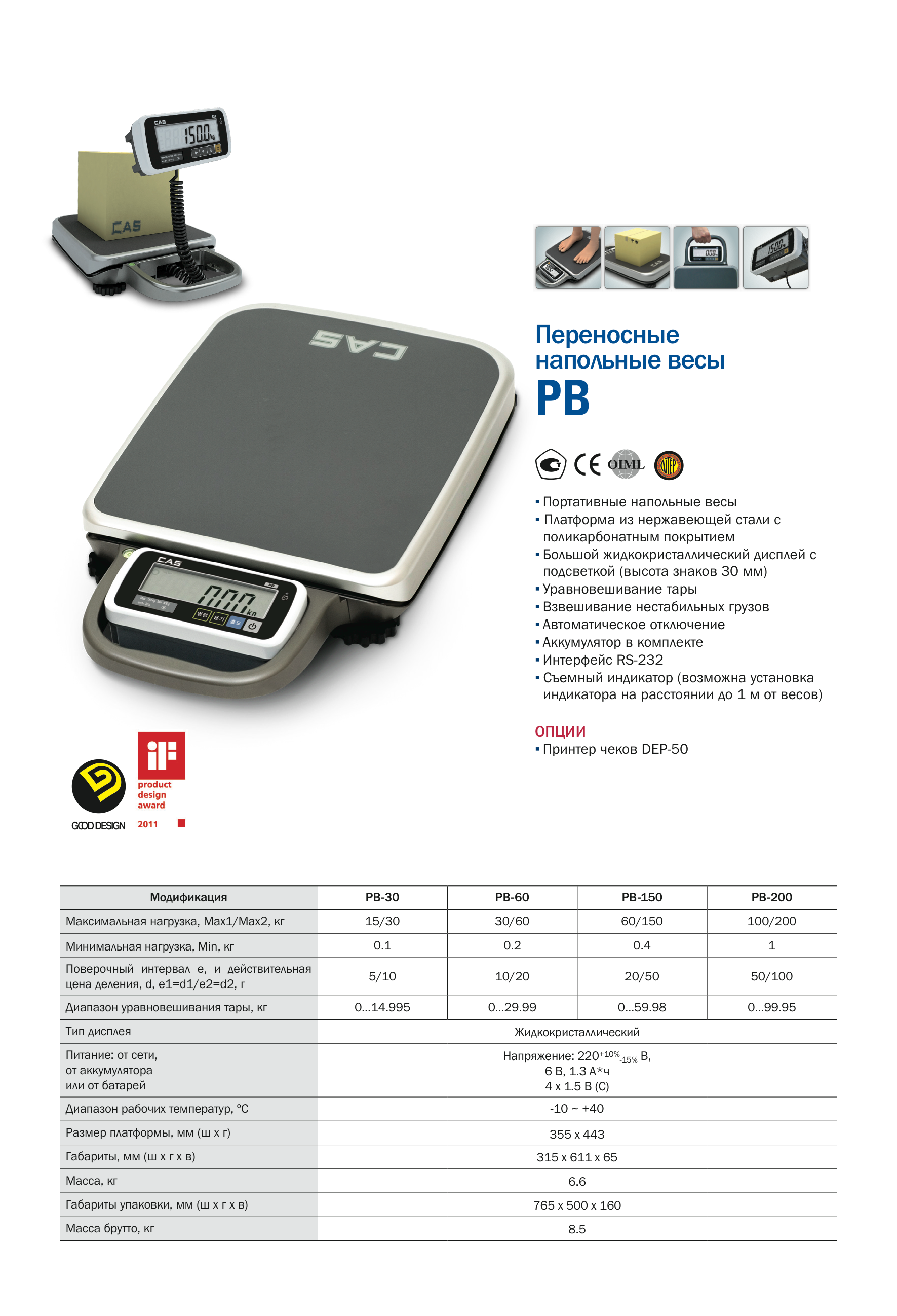 Напольные весы CAS PB-30 используются на предприятиях общественного питания и торговли. Модель оснащена жидкокристаллическим дисплеем с подсветкой на витом шнуре, тензометрическим типом измерения, усреднением показаний массы при нестабильной нагрузке и индикацией разрядки батареи. В комплект поставки входит адаптер питания. Особенности: