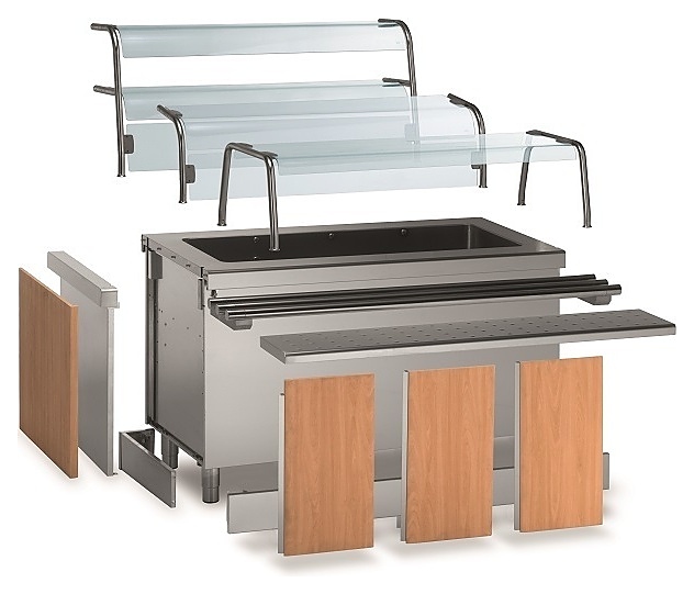 Итальянская компания Emainox специализируется на производстве линий раздачи для предприятий общественного питания. Линии раздачи комплектуются: подкатными тележками, кассетами, полками, направляющими для подносов, дополнительным освещением. Основу составляют 4 базовые технологические группы: тепловая, охлаждаемая, нейтральная и вспомогательная. |