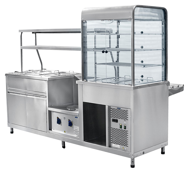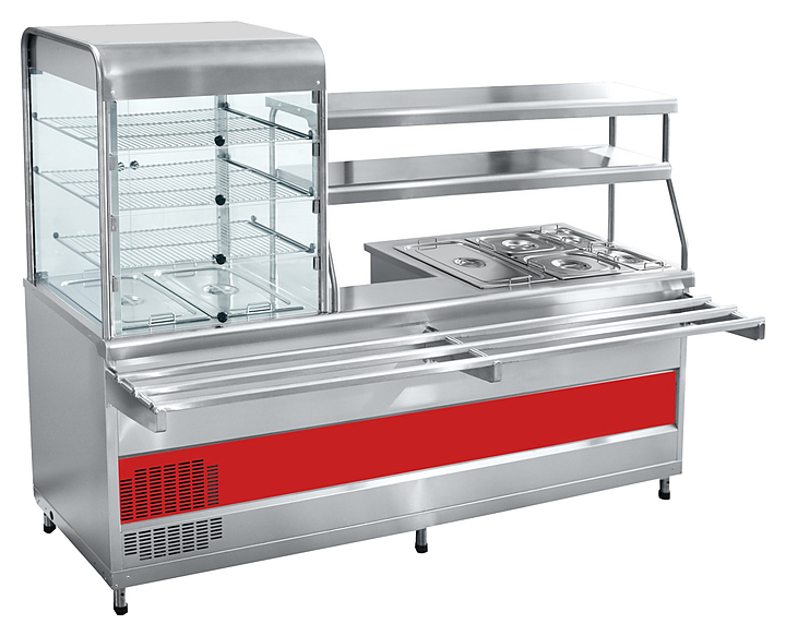 Прилавок-витрина Abat ПВХМ-70КМУ используется в составе линии раздачи Мини для демонстрации, охлаждения, кратковременного хранения и поддержания первых и вторых блюд в горячем состоянии на предприятиях общественного питания и торговли. Этому способствует наличие холодильной витрины и мармитного отдела для первых и вторых блюд. Модель оснащена регулируемыми по высоте ножками. Особенности: