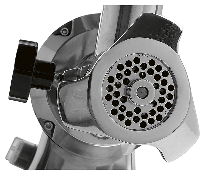 Мясорубка Fama TS 12 FTS 126E предназначена для измельчения мяса и рыбы на фарш, повторного измельчения котлетной массы и набивки колбас на предприятиях общественного питания и торговли. Корпус выполнен из литого под давлением алюминиевого сплава, решетка и самозатачивающийся нож - из нержавеющей стали, шнек - из сплава никеля. В комплект поставки входят пластиковый толкатель, лоток для подачи мяса и приемный лоток. Особенности: