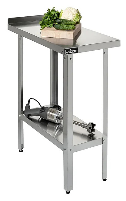 Производственный стол Koбор СПБ-100/60/430 используется на предприятиях общественного питания и торговли для разделывания и обработки пищевых продуктов, а также в качестве вспомогательной поверхности для кухонного оборудования. Каркас выполнен из уголка нержавеющей стали, столешница и полка - из нержавеющей стали AISI 430, столешница укреплена листом ламинированной древесностружечной плиты с внутренней стороны.