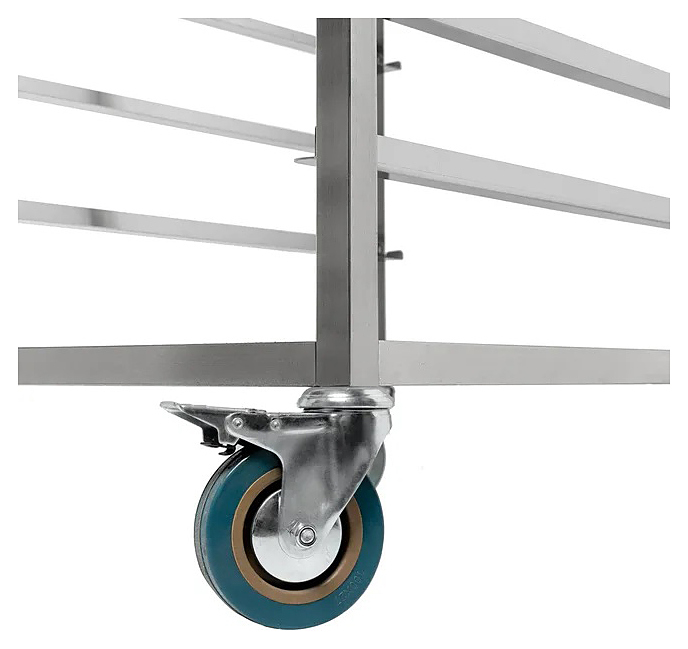 Тележка-шпилька Кобор ШП-48/31 применяется для технологического хранения и транспортировки кондитерских противней, гастроемкостей и подносов. Направляющие изготовлены из нержавеющей стали, рама произведена из нержавеющей квадратной трубы 25х25 мм. Перемещение шпильки осуществляется за счет четырех поворотных колес, диаметром 100 мм, два из которых имеют тормоз.