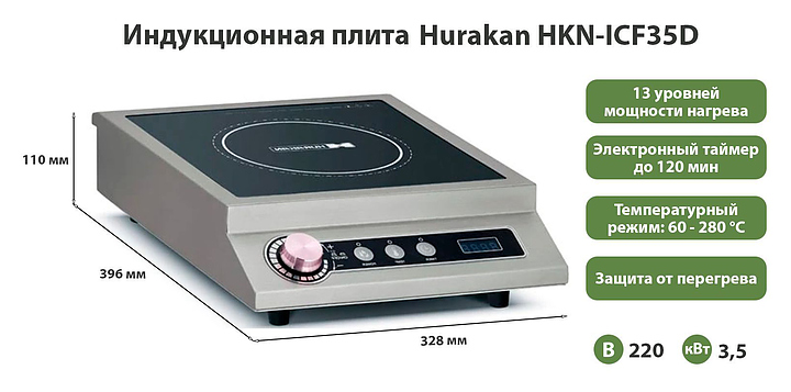 Индукционная плита Hurakan HKN-ICF35D предназначена для приготовления блюд в наплитной посуде на предприятиях общественного питания и торговли. Индукционная конфорка включается сразу после установки на нее посуды и выключается, когда ее убирают, за счет этого сокращается энергопотребление и улучшается микроклимат в кухонном помещении. Модель оснащена кнопочной панелью управления и активным джойстиком. Корпус выполнен из нержавеющей стали. Рекомендуется использовать специальную посуду из материала с подходящими характеристиками, который бы эффективно поглощал энергию магнитного поля. Особенности: