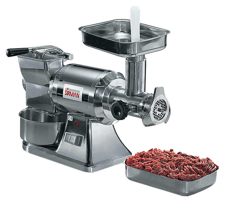 Мясорубка-терка Sirman TCG 22Е предназначена для измельчения мяса и рыбы на фарш, повторного измельчения котлетной массы и набивки колбас, так же для натирания сыра и сухарей на предприятиях общественного питания и торговли. Модель оснащена системой вентиляции мотора, обеспечивающей защиту от перегрева и предохранительным микровыключателем на рычаге тёрки. Корпус выполнен из литого полированного алюминия, горловина и шнек - из пищевого чугуна, нож и решетка из высококачественной пищевой нержавеющей стали, измельчитель сыра с терочным валиком - из пищевой стали. В комплект поставки входят нож, решетка и толкатель из пластика. Особенности: