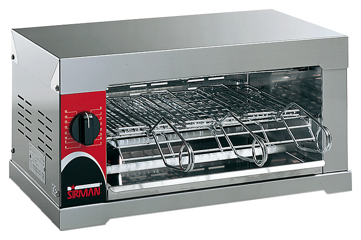 Тостер Sirman 6Q используется на предприятиях общественного питания и торговли для приготовления тостов, подогрева пиццы, полуфабрикатов и бутербродов, а также приготовления сосисок, гамбургеров, пресных лепешек "пьядина" и тостов с начинкой. Модель оснащена кварцевыми нагревательными элементами, таймером и удаляемой ванночкой для сбора остатков. В комплект поставки входят хромированные нержавеющие щипцы. Особенности: