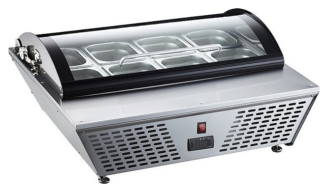 Витрина для мороженого Koreco RTD67L используется на предприятиях общественного питания и торговли для демонстрации и хранения мороженого, сорбета и йогурт-мороженого. Корпус трапециевидного сечения, зауженный к низу, выполнен из нержавеющей стали, крышка - из стекла. Особенности: