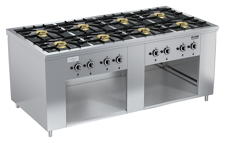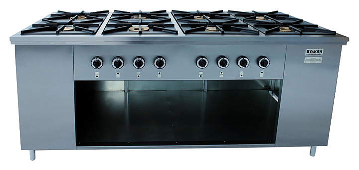 Газовая плита Вулкан ПРГ-IIA-8 Maxi предназначена для приготовления первых, вторых и третьих блюд в наплитной посуде на предприятиях общественного питания и торговли. Модель оснащена газ-контролем, пьезорозжигом и запальной горелкой. Корпус выполнен из нержавеющей стали, решетка - из чугуна, газовые горелки - из латуни. Особенности:
