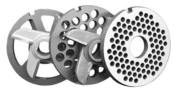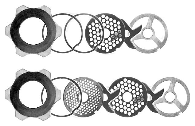 Компания ТОРГТЕХМАШ производит промышленные мясорубки для предприятий общепита и торговли. Существует несколько наборов: классический (шнек, односторонний нож, решётка), полуунгер (шнек, подрезной нож, двусторонний нож, решётка), полный унгер (шнек, подрезной нож, двусторонний нож, решётка крупная, решётка мелкая). |
