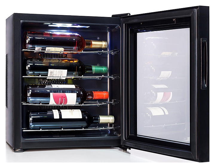 Винный шкаф Cavanova CV004P создает оптимальные условия для сохранения всех вкусовых свойств разливного вина в барах, ресторанах, специализированных магазинах, частных домах или квартирах. Модель оснащена светодиодной подсветкой мягкого синего цвета. Корпус выполнен из окрашенного металла, дверь - из рамки черного цвета и двойного тонированного стеклопакета с УФ-фильтром, полки - хромированые. Дополнительные крепления на задней стенке корпуса позволяют подвесить шкаф на стену. Особенности: