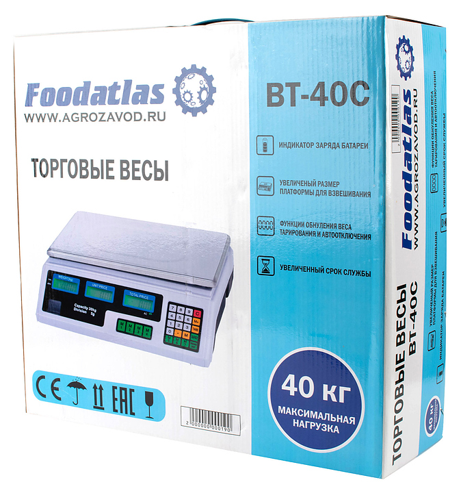Торговые весы Foodatlas ВТ-40С используются на предприятиях общественного питания и торговли. Модель оснащена ЖК-индикаторами с подсветкой: вес, цена и стоимость. Память аппарата рассчитана на 7 товаров. Платформа выполнена из нержавеющей стали и пластика. Характеристики: