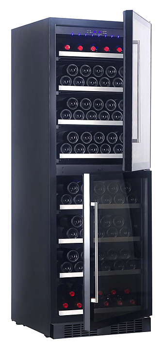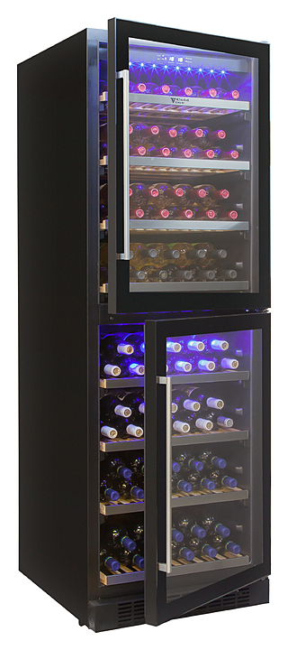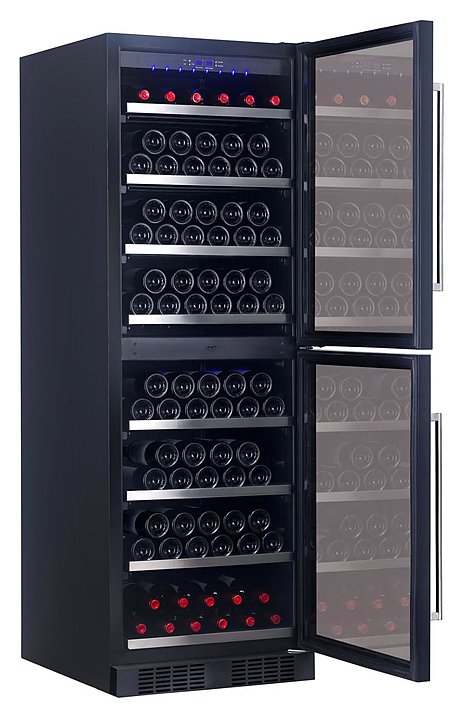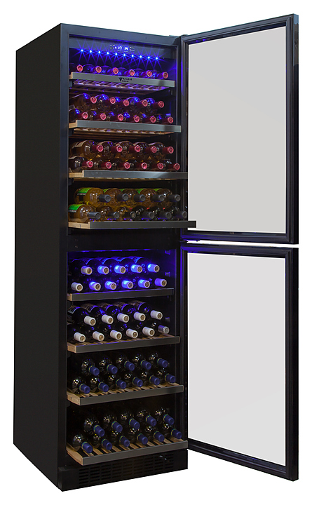 Винный шкаф Cold Vine C142-KBT2 создает оптимальные условия для сохранения всех вкусовых свойств разливного вина. Модель оснащена встроенными вентиляторами в каждой зоне, 8 деревянными полками со стальным обрамлением и лаковым покрытием на металлических направляющих (все, кроме нижней) и голубой светодиодной подсветкой. Корпус выполнен из окрашенной в черный цвет стали, дверь в черной раме - из тонированного прозрачного тройного стекла с УФ-фильтром. Особенности: