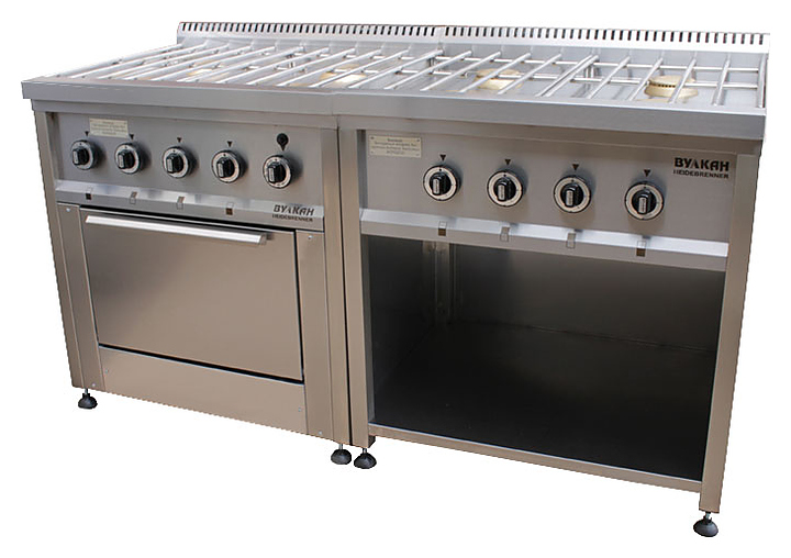 Компания Вулкан совместно с немецким производителем HEIDEBRENNER GmbH разрабатывает и выпускает тепловое оборудование для профессиональной кухни: газовые плиты и жарочные шкафы, пищеварочные котлы, фритюрницы, блинницы, оборудование для китайской кухни, плиты ВОК и Теппан-яки, лавовые грили, газовые горелки для казанов и пр. |