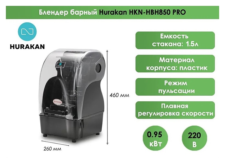 Блендер Hurakan HKN-HBH850 PRO предназначен для смешивания всевозможных ингредиентов для коктейлей, супов-пюре, кремов и муссов на предприятиях общественного питания и торговли. Модель оснащена влагозащищенной панелью управления, автоматическим таймером на 30 / 60 / 90 секунд, защитой от перегрева, ножом с 4 стальными лезвиями и органайзером для шнура. Звукопоглощающие кожух и пластиковый экран позволяют снизить уровень шума при работе оборудования. Видео