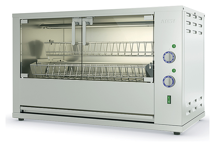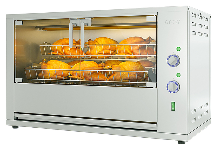 Гриль для кур ATESY Командор-5Э-Т-380 используется на предприятиях общественного питания и торговли для жарки тушек кур, цыплят, куриных окорочков, грудок и других продуктов питания. Модель оснащена 4 легкосъемными садками (люльками), вращающимися вокруг центральной оси внутри рабочей камеры. Корпус выполнен из пищевой нержавеющей стали AISI 430, садки для кур - из нержавеющего прутка, двери - из закаленного термостойкого ударопрочного стекла. Особенности: