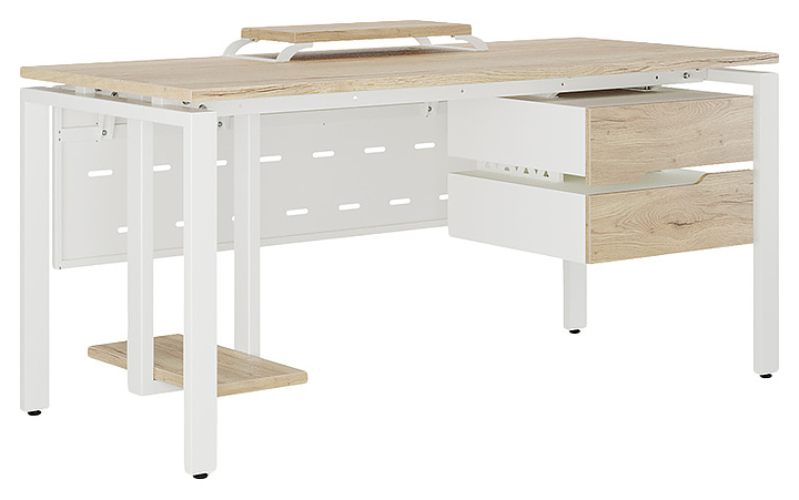 Компьютерный стол Кобор KP-180/70 white/natural используется в офисных помещениях и кабинетах руководителей. Модель оснащена П-образными опорами. Каркас выполнен из металла, выкрашенного в цвет белый муар (RAL9016), столешница – из ламинированной древесно-стружечной плиты (ЛДСП) цвета натуральный дуб (H1180 ST37). Опции (заказываются отдельно):