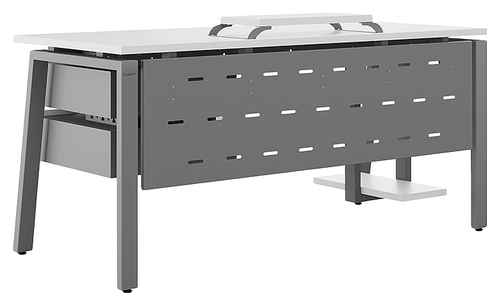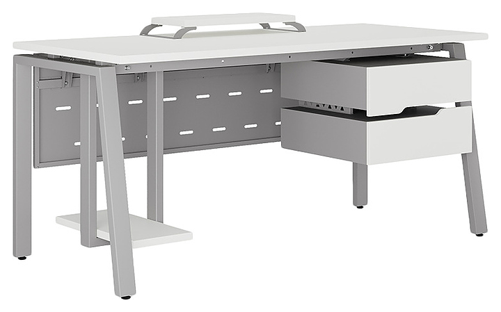 Компьютерный стол Кобор КAB-160/70 aluminum/premium используется в офисных помещениях и кабинетах руководителей. Модель оснащена A-образными опорами со скошенными фронтальными сегментами. Каркас выполнен из металла, выкрашенного в цвет алюминиевый металлик (RAL9006), столешница – из ламинированной древесно-стружечной плиты (ЛДСП) цвета белый премиум (W1000 ST9). Опции (заказываются отдельно):